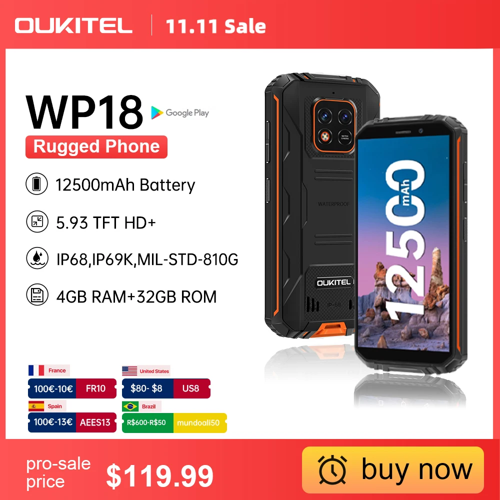 Special Offer [W Stcok]Oukitel WP18 12500mAh Wytrzymały Smartfon 5.93 "4G + 32G Android 11 Telefon Komórkowy HelioA22 13MP Czterordzeniowy Telefon Komórkowy Discount (43%OFF) Today!